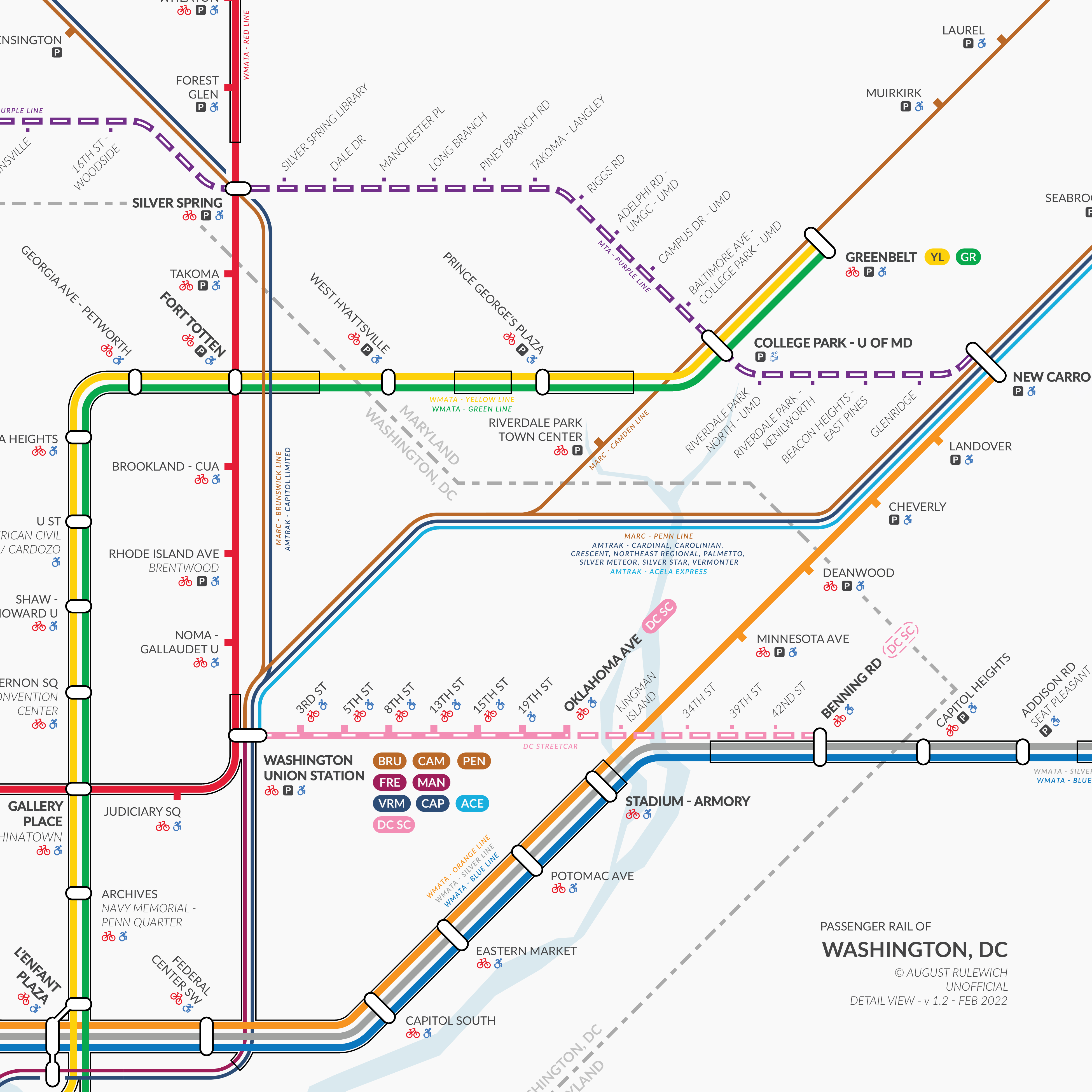 Includes the WMATA Metro, DC Streetcar and Purple Lines, MARC, VRE, Baltimore Link lines, and Amtrak, as well as various station features such as accessibility and Capitol Bike access.